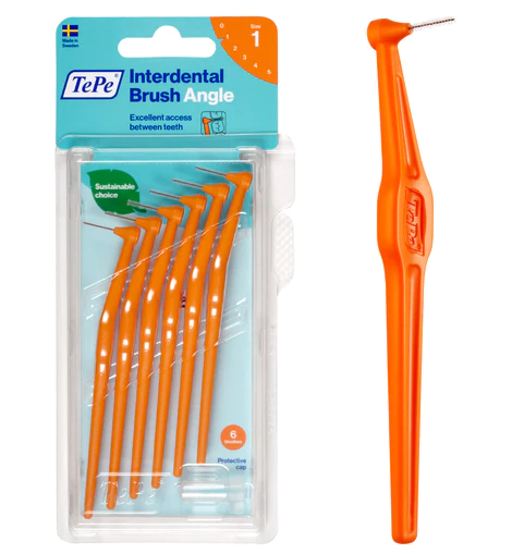 An interdental brush by TePe, designed to clean the gaps between the teeth, where a regular toothbrush is unable to reach. Use daily to keep gums and teeth healthy and fresh. The interdental brush can be used for cleaning between teeth, implants, crowns, and bridges. It’s also suitable for cleaning around brackets and wires during orthodontic treatment. TePe Angle comes in 6 colour-coded sizes to fit narrow as well as wide gaps – ISO sizes 0-5. It has a long handle and an angled brush head for easier access between the back teeth, both from the inside and the outside of the mouth.