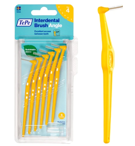 An interdental brush by TePe, designed to clean the gaps between the teeth, where a regular toothbrush is unable to reach. Use daily to keep gums and teeth healthy and fresh. The interdental brush can be used for cleaning between teeth, implants, crowns, and bridges. It’s also suitable for cleaning around brackets and wires during orthodontic treatment. TePe Angle comes in 6 colour-coded sizes to fit narrow as well as wide gaps – ISO sizes 0-5. It has a long handle and an angled brush head for easier access between the back teeth, both from the inside and the outside of the mouth.
