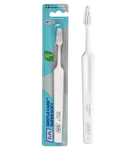 TePe Gentle Care is a super soft toothbrush recommended as the second brush stage after oral surgery and for patients with sore or very delicate oral tissue, very sensitive root surfaces, extremely dry mouth, and after radiotherapy. Additional areas of use can occur upon recommendation from a dental professional. Consult your dental professional regarding the use of TePe Gentle Care. TePe Gentle Care is slightly firmer than TePe Special Care. The neck can be angled in hot water for better access. By replacing fossil raw material with plant-based material in a mass balance system, we have reduced the carbon footprint of the Gentle Care by around 80% – without compromising on product quality, efficiency, or design.