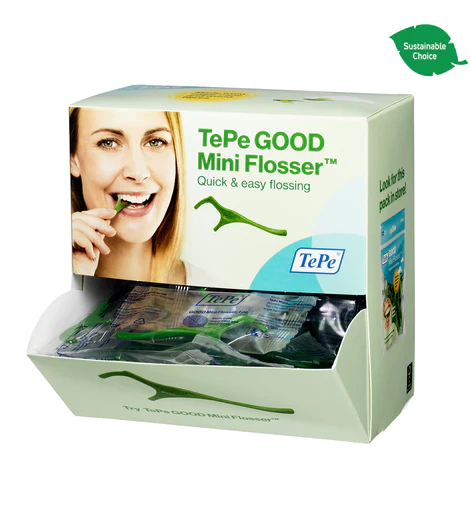 TePe GOOD Mini Flosser is a pre-loaded floss holder for efficient and convenient use. It contains strong, PFAA free floss, which glides easily through narrow interdental spaces. The cleverly designed bite plane helps to gently insert the floss. The slender handle fits comfortably in the hand. An excellent cleaning aid for tight spaces between the teeth – use daily to keep gums and teeth healthy and fresh. Thanks to the use of renewable raw materials in the handle – sugar cane and wood fibres – we manage to recirculate 85 % of the carbon dioxide emissions during the products life cycle. The GOOD Mini Flosser comes in a bag made from sugar cane.