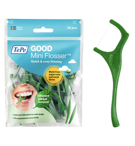 TePe GOOD Mini Flosser is a pre-loaded floss holder for efficient and convenient use. It contains strong, PFAA free floss, which glides easily through narrow interdental spaces. The cleverly designed bite plane helps to gently insert the floss. The slender handle fits comfortably in the hand. An excellent cleaning aid for tight spaces between the teeth – use daily to keep gums and teeth healthy and fresh. Thanks to the use of renewable raw materials in the handle – sugar cane and wood fibres – we manage to recirculate 85 % of the carbon dioxide emissions during the products life cycle. The GOOD Mini Flosser comes in a bag made from sugar cane.