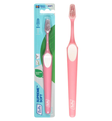The Supreme toothbrush is an innovative and sustainable toothbrush developed by TePe in collaboration with dental experts for efficient and gentle plaque removal. TePe Supreme has a two-level filament design.
